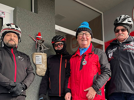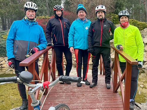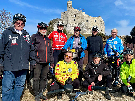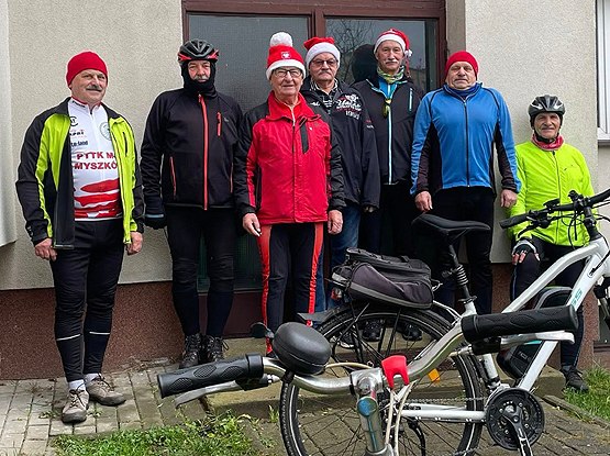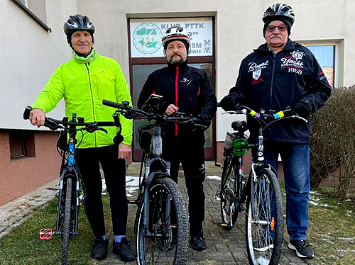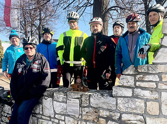 XIII noworoczna 2021 rowerowa przejażdżka do Leśniowa Z uwagi na obostrzenia spowodowane pandemią koronawirusa tegoroczna XIII zimowa przejażdżka rowerowa prowadziła do Leśniowa. Na kościelnych schodach spotkali się rowerzyści jadący z Myszkowa, przybysze ze Złotego Potoku, a także piechurzy, którzy wszyscy razem, ale osobno i w stosownych odległościach, spożyli gorącą strawę ufundowaną przez skarbniczkę Klubu PTTK "M-2" (jako że termometr oscylował wokół zera, a mgła i wilgotne powietrze potęgowały odczucie zimna), po czym rozjechali się w rożnych kierunkach na dalszy trening wytrzymałościowy. Na starcie gratulacje z okazji zdobycia brązowych odznak "Śladami miejsc pamięci narodowej" przyjmowali Marian Kotarski, Jan Imiełowski i Ryszard Konopka. |
